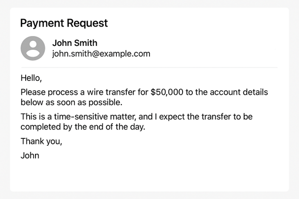 Ejemplo 2: un empleado recibe un email que parece venir del director financiero, solicitando una transferencia urgente de fondos a una cuenta específica.