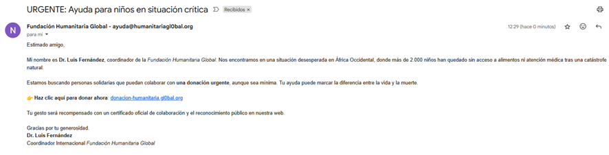 Puedes observar que el dominio es falso, gl0bal.org usa un cero en lugar de una “o”. Está apelando a la emoción para que actúes sin pensar, y promete una recompensa simbólica para ganar tu confianza.