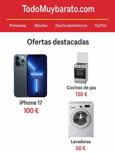 Compras un móvil por 99€ en una tienda desconocida. Nunca llega. El sitio desaparece a los pocos días. Aquí, puedes ver una tienda online ficticia con productos de alta gama a precios increíblemente bajos.