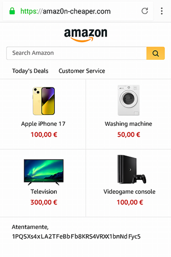 Entras en una web que imita el diseño Amazon, pero no es la página real ya que la URL es altamente sospechosa (https://amaz0n-cheaper). Aparecen productos de alta gama con precios exageradamente bajos. Haces una compra, pero nunca llega, y el sitio deja de estar disponible al poco tiempo.