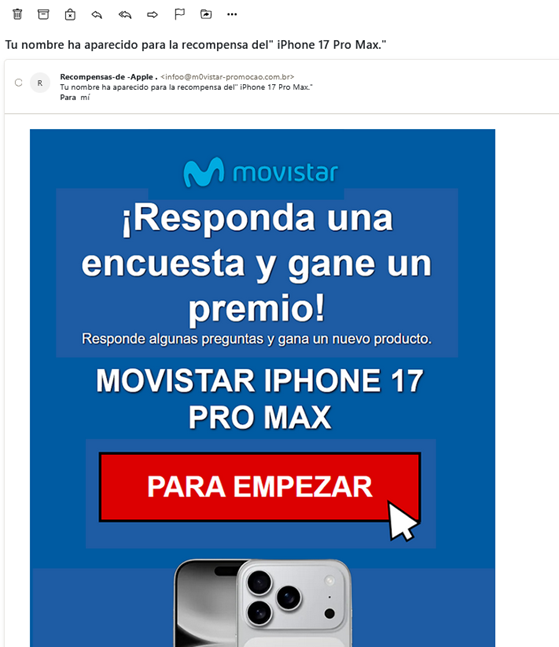 Un supuesto email de Movistar en el que nos indica que podemos ganar un iPhone al responder una encuesta. Si se clica en la imagen, nos llevará a un formulario para introducir datos sensibles.