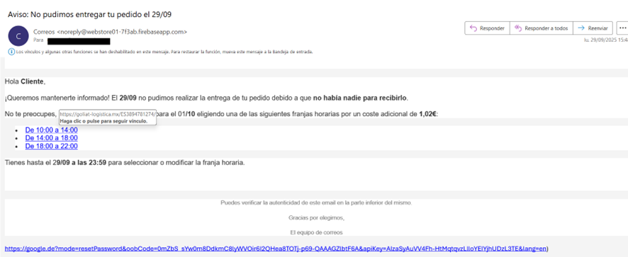 Podrás ver que tanto el remitente como los enlaces son altamente sospechosos, el correo no está bien formado y, además de la urgencia, cobran una tarifa por recibir el supuesto paquete. Los enlaces llevan a formularios para robar los datos que ahí se rellenen.