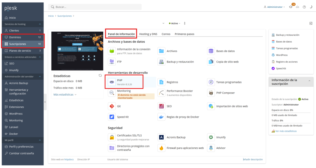 Desde el panel de Plesk, entra dentro del panel del dominio de la web y en la pestaña "Panel de Información" haz clic en la opción de "PHP":