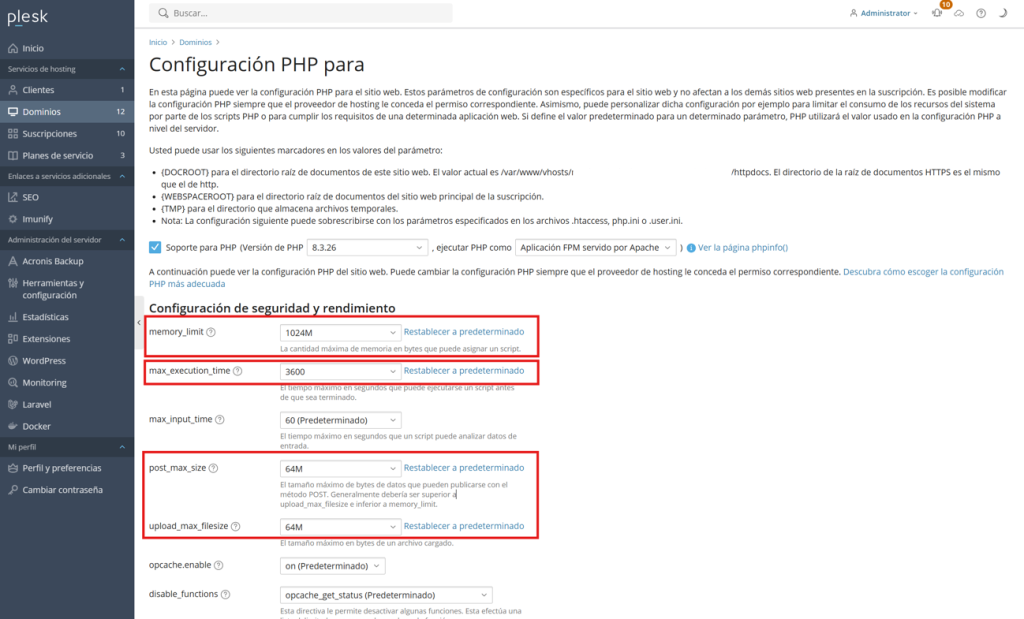 • Límite de memoria: Si no fuera correcto, deberás asignar como mínimo lo que te pone en "Recomendado" a través de Plesk (te indicamos cómo más abajo en esta guía).