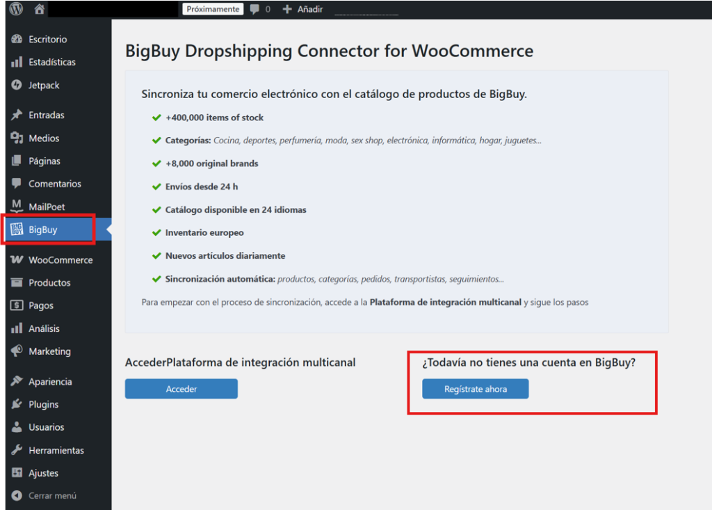 Una vez instalado el plugin en WordPress, debes conectarlo a tu cuenta de Bigbuy. Si no tienes cuenta aún en Bigbuy, ve al menú "Bigbuy" de WordPress y luego haz clic sobre el botón "Regístrate ahora".