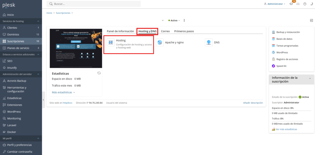 Para configurar el cron primero debes asignar al usuario de Plesk una shell (consola). Para ello, en tu panel de Plesk, entra dentro del dominio de la web y en la pestaña "Hosting y DNS" haz clic en la opción de "Hosting":