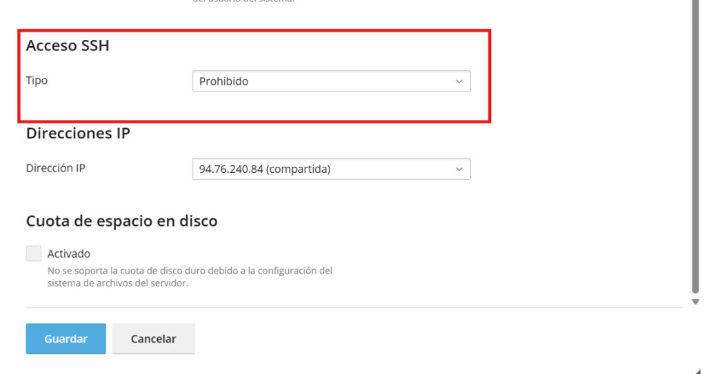 Te aparecerán varias opciones, baja hasta la sección “Acceso SSH” y haz clic sobre el desplegable de "Tipo":
