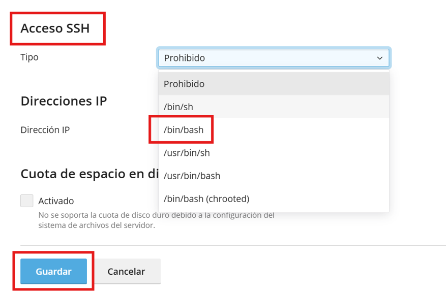 Y escoge la opción “/bin/bash” del desplegable. Luego, haz clic en el botón de "Guardar”: