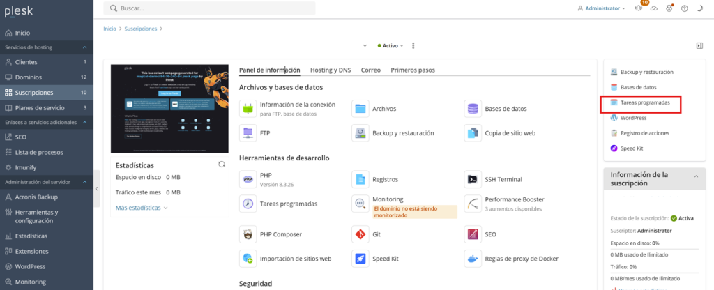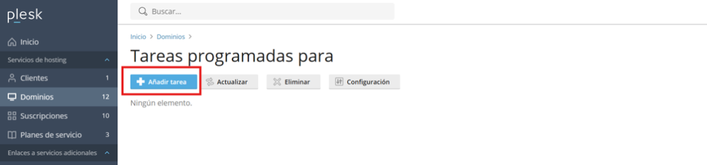 Luego, vuelve a Plesk y clica en la columna de la derecha sobre “Tareas programadas”: