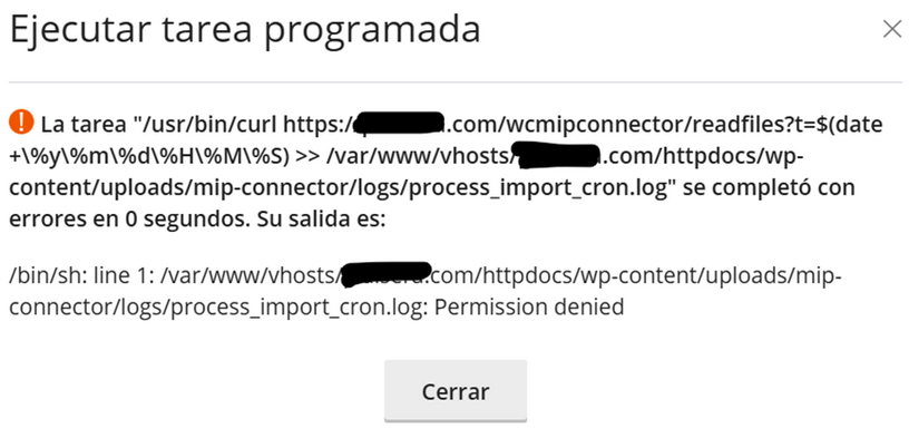En este caso el error es debido a que no se ha seleccionado en el apartado de "Espacio web" el dominio correcto y la tarea se ejecuta con el usuario equivocado, de ahí que no tenga permisos. Tras corregirlo, ya se ejecuta de forma correcta nuevamente.