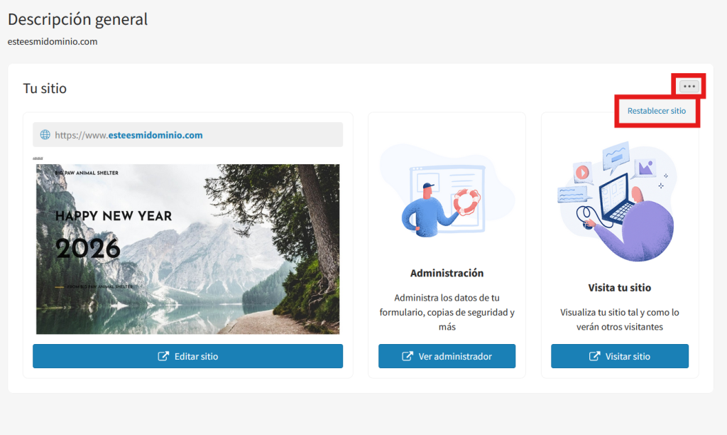 Y luego, haz clic sobre el botón que tiene los tres puntos horizontales y luego haz clic en "Restablecer sitio":