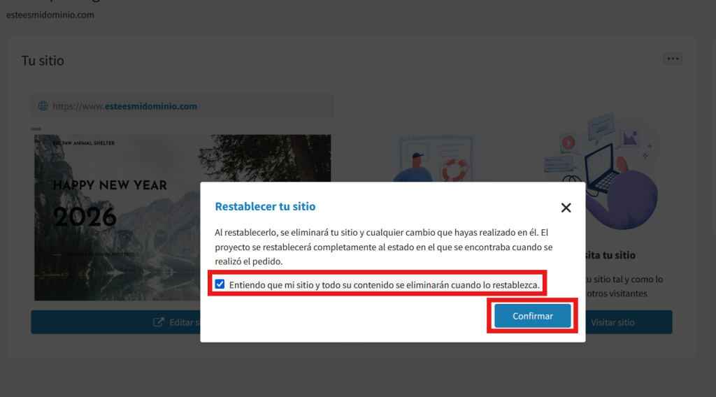 Se te abrirá una pequeña ventana pidiéndote confirmación. Marca la opción "Entiendo que mi sitio y todo su contenido se eliminarán cuando lo restablezca." y luego, haz clic en el botón "Confirmar":