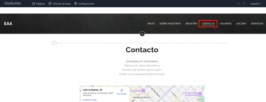 Ahora estarás dentro del editor web. Para empezar a editar una página, haz clic sobre la misma en el menú superior. En nuestro ejemplo, queremos crear un formulario en la página de "Contacto":