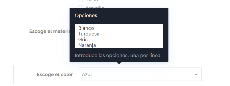 Al igual que con el campo de "Elección única", este campo sirve para que el visitante tenga que escoger 1 sola opción entre varias que se le presentan, pero en forma de desplegable. Esta opción se recomienda cuando la lista de opciones es muy larga y hacerlo con "Elección única", ocuparía mucho espacio.
