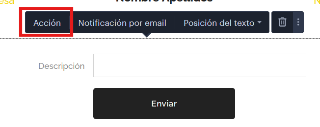 Cuando el visitante envíe el formulario, necesitará alguna confirmación de que este envío se ha realizado. Para ello, disponemos de la opción "Acción", que podrás ver haciendo un solo clic sobre el formulario: