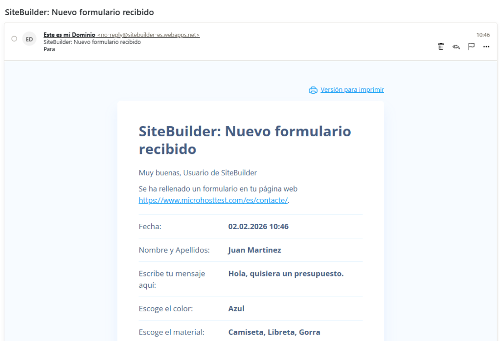 Y cuando alguien envíe el formulario, te llegará un correo como este:
