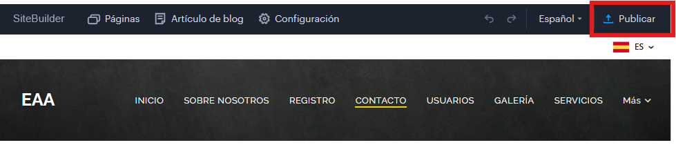 Una vez hayas realizado todos estos cambios, para que los visitantes puedan verlos deberás de publicar la página. Para ello, haz clic en el botón "Publicar" que encontrarás en tu editor, arriba a la derecha: