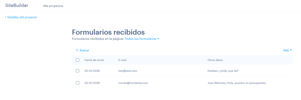 Y aquí verás una lista de los formularios que han sido enviados a través de tu página web: