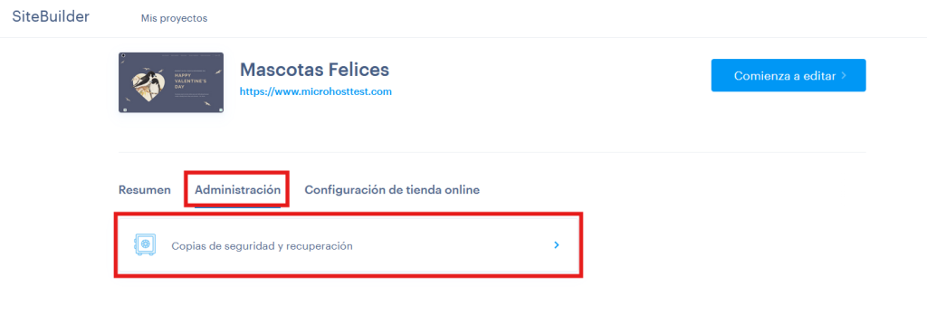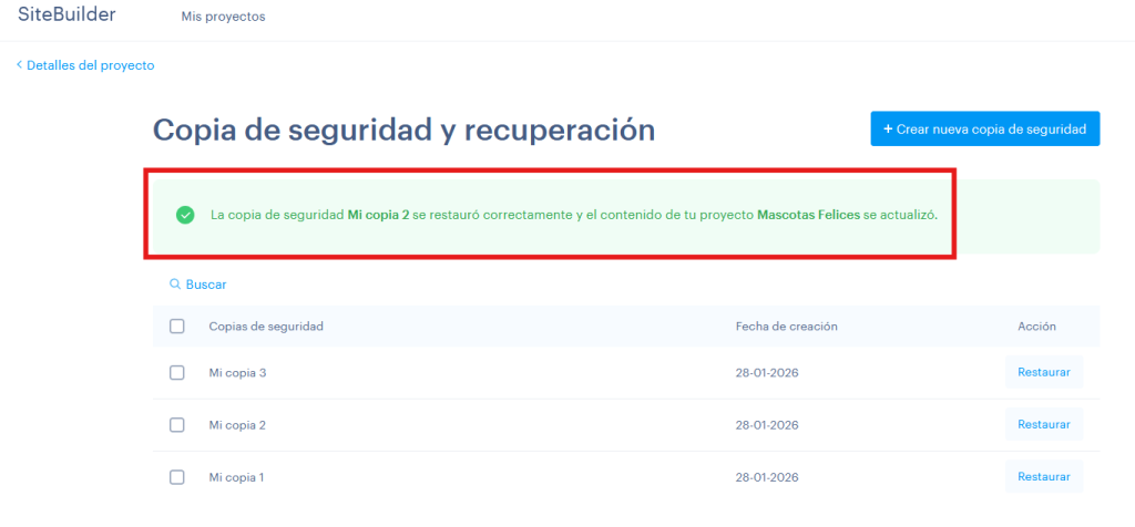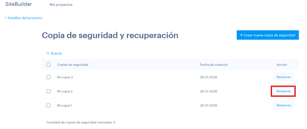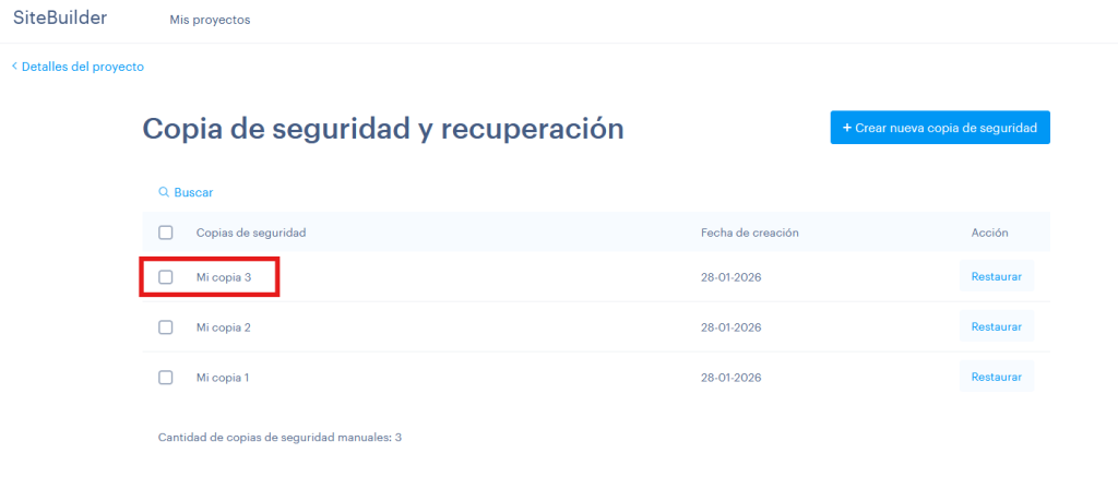 En Sitebuilder y Shopbuilder, las copias de seguridad no se realizan de forma automática, sino que es el propio usuario el que las realiza. Te recomendamos crear una copia de la web, antes de iniciar modificaciones importantes en la misma.