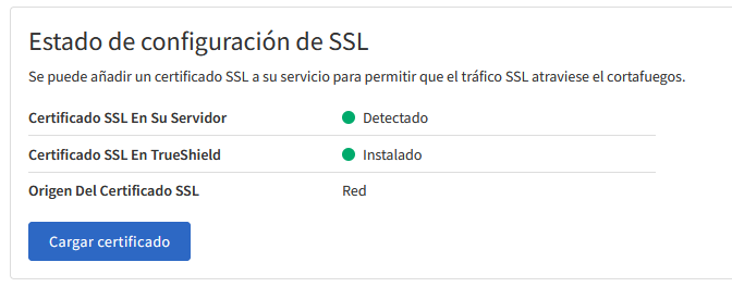 A la derecha, verás varias opciones, baja hasta la sección "Estado de configuración SSL". Si es la primera vez que lo instalas en Sitelock, verás que te indican que el SSL no está detectado ni instalado (si no es la primera vez que lo instalas, es posible que te aparezcan en verde estas opciones, porque detectan el SSL anterior). Haz clic en el botón "Cargar certificado":
