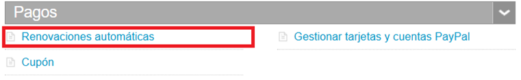 Seguidamente, dirígete al apartado de “Renovaciones automáticas” dentro de “Pagos”, que se encuentra en la parte de abajo del menú.