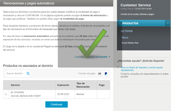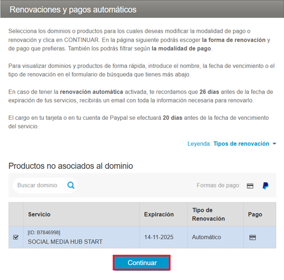Ahora selecciona el dominio o servicio cuya forma de pago deseas modificar, para a continuación hacer click en el botón azul de “Continuar” de la parte inferior.