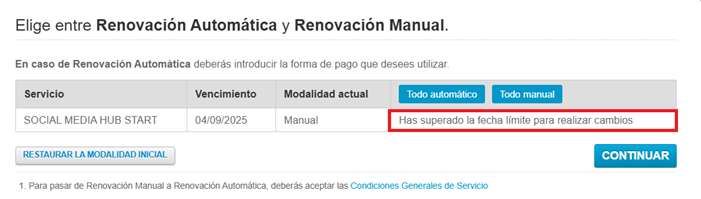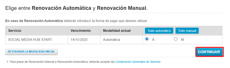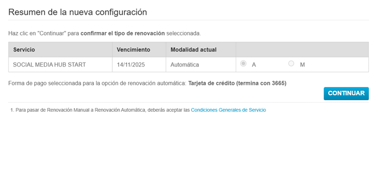 Se te abrirá una ventana en la cual deberás marcar la “A” para mantener la renovación como Automática, mientras que la “M” indica que esta será Manual. Para confirmar, haz click en el botón azul de “Continuar”.