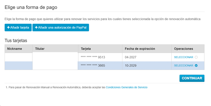 A continuación, te aparecerán las tarjetas bancarias y cuentas PayPal que tengas guardadas en tu cuenta y podrás seleccionar la que deseas configurar para tu renovación automática. Para confirmar, haz click nuevamente en el botón azul de “Continuar” en dos ocasiones más: