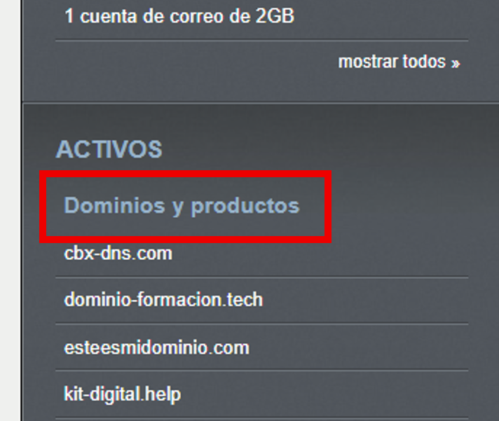 Una vez accedas a tu panel de control, en el gran cuadro gris de la derecha clica en Dominios y Productos: