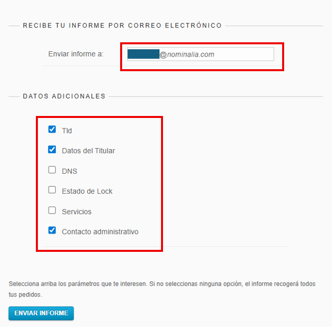 Clica en esta última opción, y en la página a continuación podrás seleccionar qué información quieres incluir en el listado y a qué dirección recibirla: