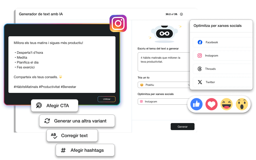 Genera textos, campanyes i hashtags a l'instant.